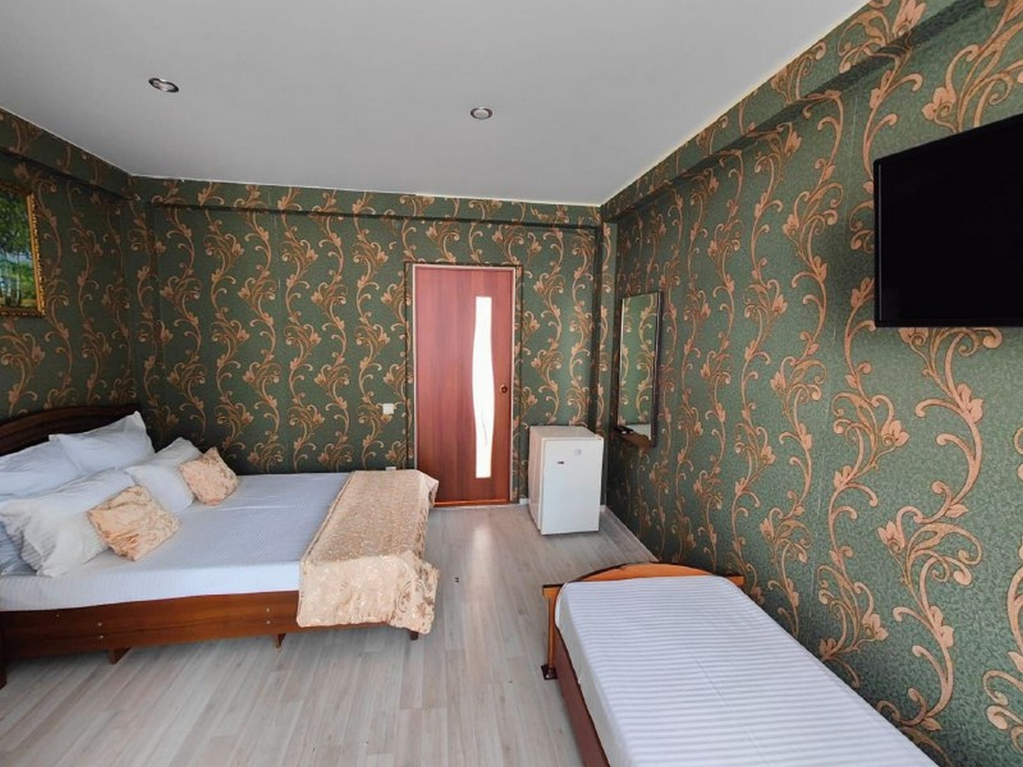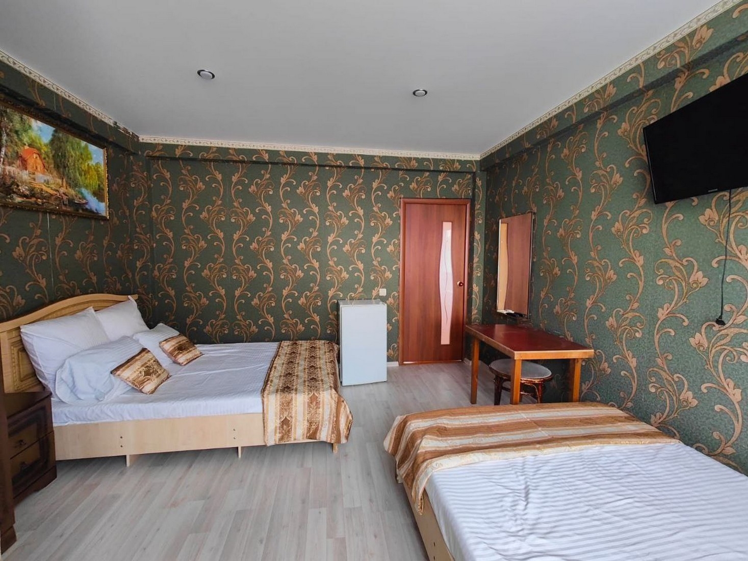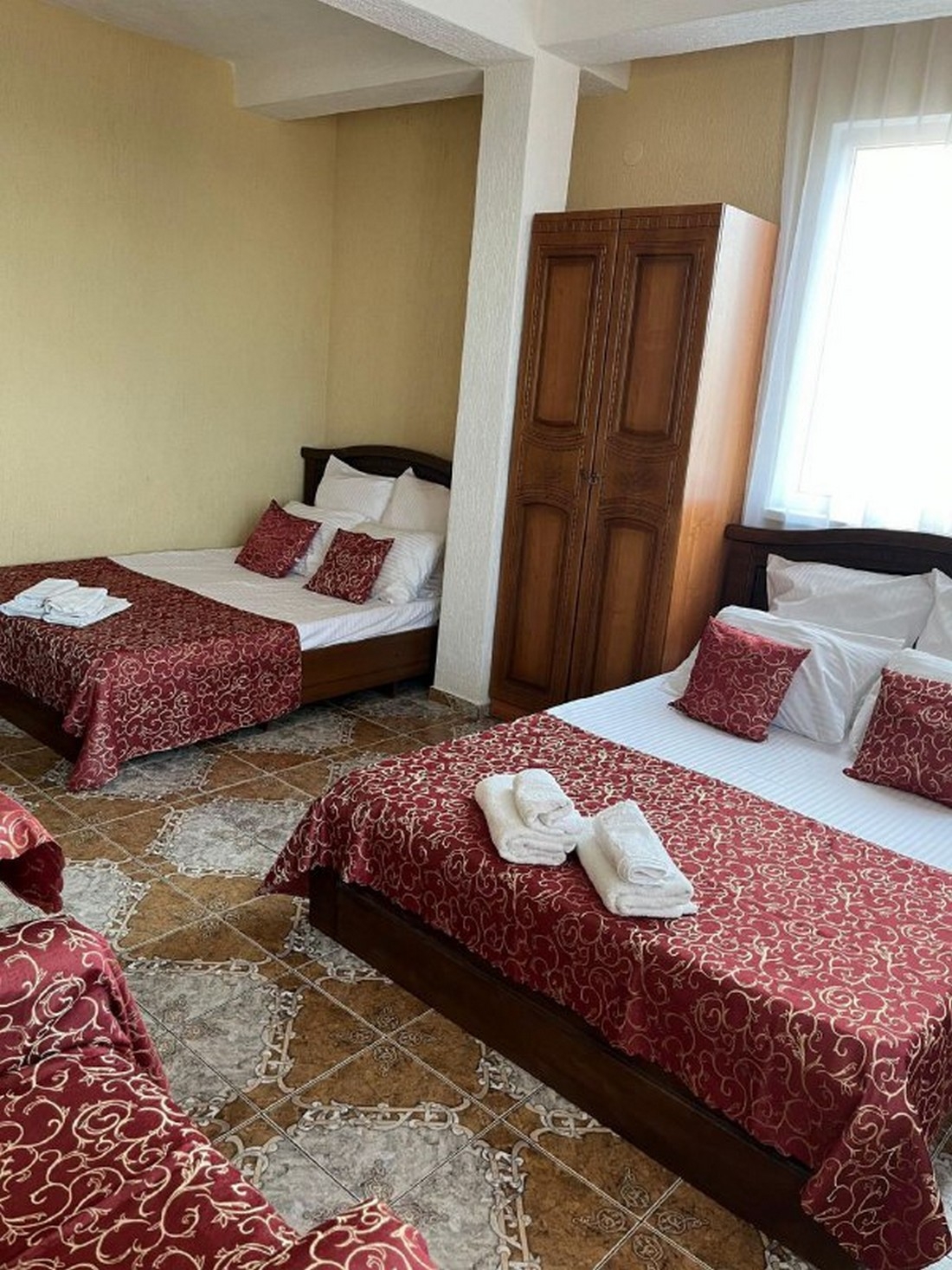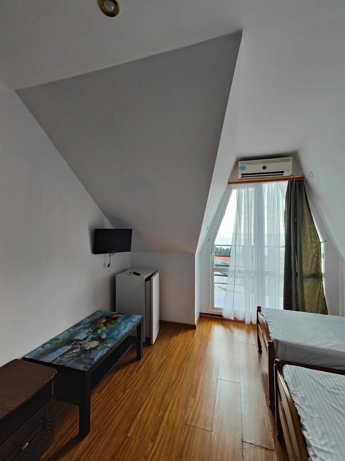 Трёхместный стандарт с видом на горы, площадью 18 кв.м с балконом. Подходит для размещения 3 человек (2 основных места и 1 дополнительное). Имеет спальню с приятным интерьером. Балкон. В номере: 1 двуспальная кровать и 1 односпальная кровать. Имеется телевизор, кондиционер, отопление, шкаф, вешалка, рабочий стол, туалетный столик, стулья, холодильник. Индивидуальная ванная комната: душ, раковина, туалет. В стоимость входит: халат, тапочки, фен, постельное бельё, полотенца, ванные принадлежности (шампунь, гель для душа, мыло, зубной набор). WI-Fi бесплатно на всей территории. Бесплатная частная парковка на территории.