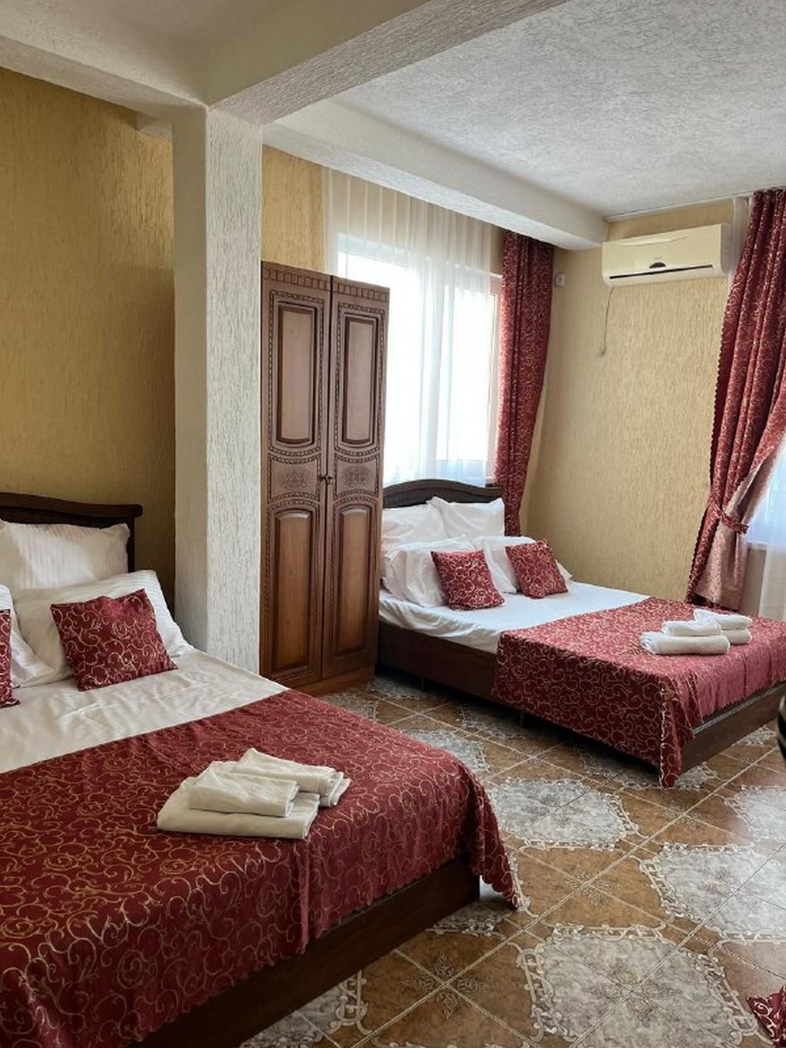 Четырёхместный стандарт с видом на горы, площадью 20 кв.м с балконом. Подходит для размещения 4 человек (2 основных места и 2 дополнительных). Имеет спальню с приятным интерьером. Балкон. В номере: 2 двуспальные кровати. Имеется телевизор, кондиционер, отопление, шкаф, вешалка, рабочий стол, туалетный столик, стулья, холодильник. Индивидуальная ванная комната: душ, раковина, туалет. В стоимость входит: халат, тапочки, фен, постельное бельё, полотенца, ванные принадлежности (шампунь, гель для душа, мыло, зубной набор). WI-Fi бесплатно на всей территории. Бесплатная частная парковка на территории.