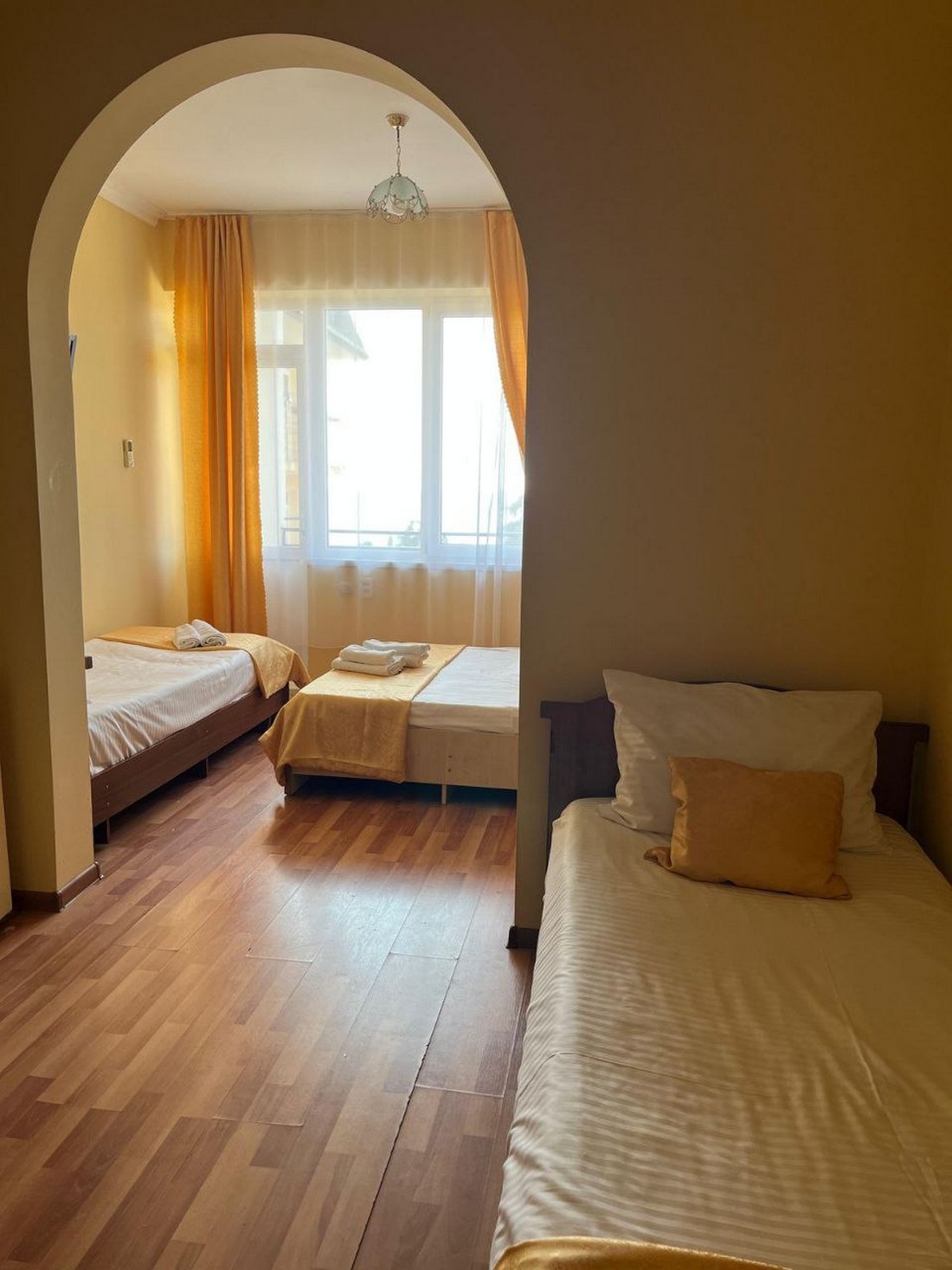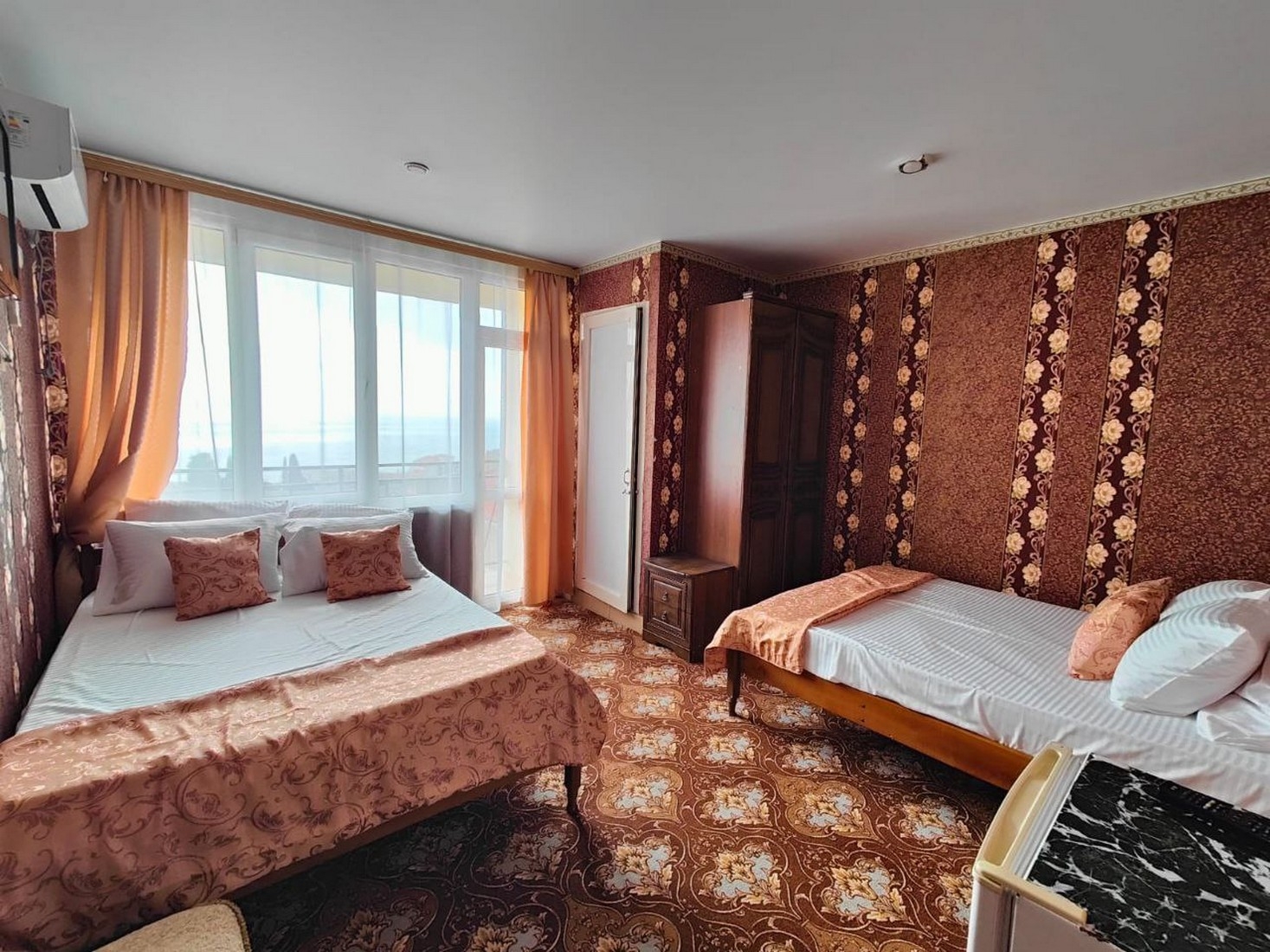 Четырёхместный комфорт с видом на море , площадью 25 кв.м с балконом. Подходит для размещения 4 человек (2 основных места и 2 дополнительных). Имеет спальню с приятным интерьером. Балкон. В номере: 1 двуспальная кровать и 2 односпальные кровати. Имеется телевизор, кондиционер, отопление, шкаф, вешалка, рабочий стол, туалетный столик, стулья, холодильник. Индивидуальная ванная комната: душ, раковина, туалет. В стоимость входит: халат, тапочки, фен, постельное бельё, полотенца, ванные принадлежности (шампунь, гель для душа, мыло, зубной набор). WI-Fi бесплатно на всей территории. Бесплатная частная парковка на территории.